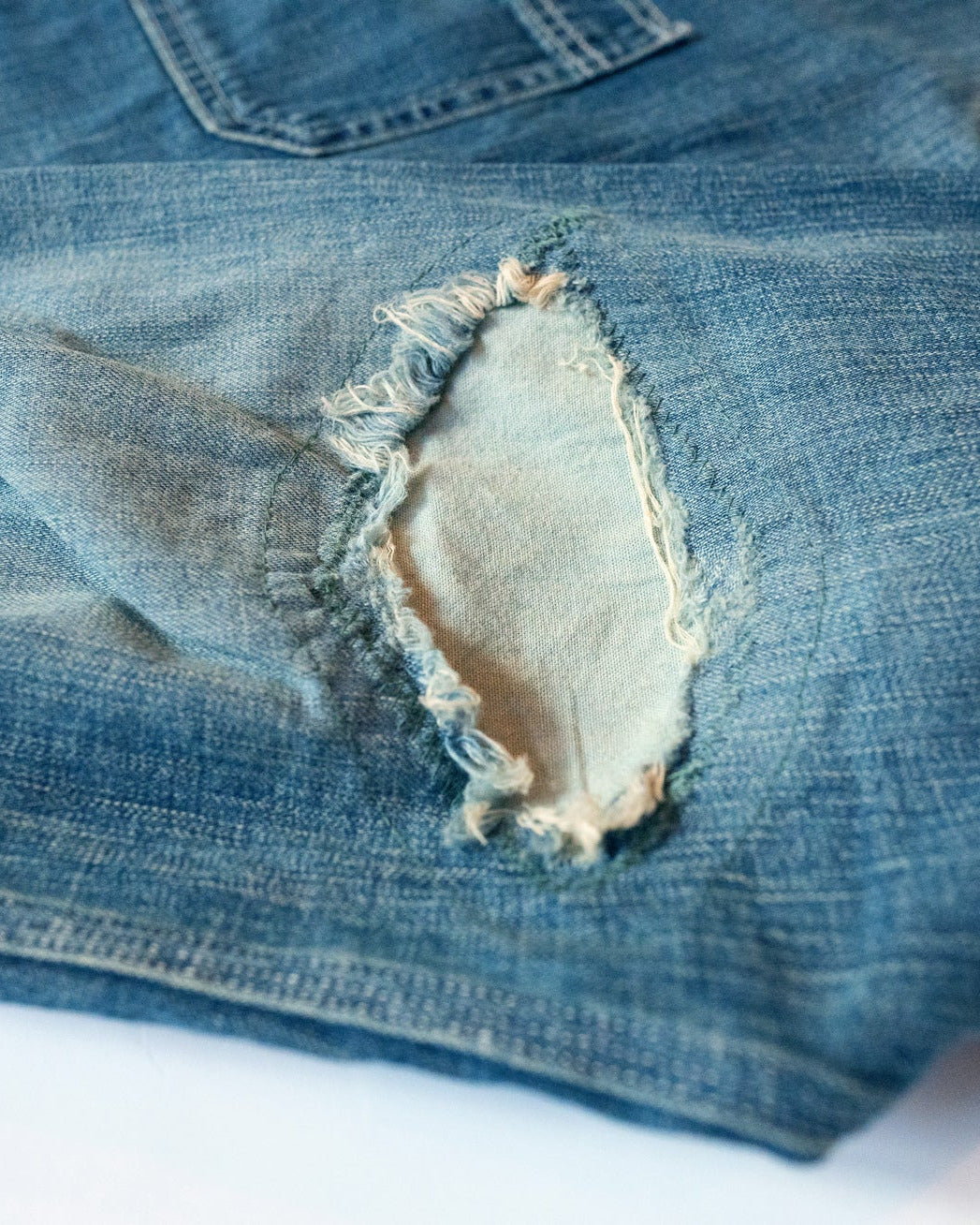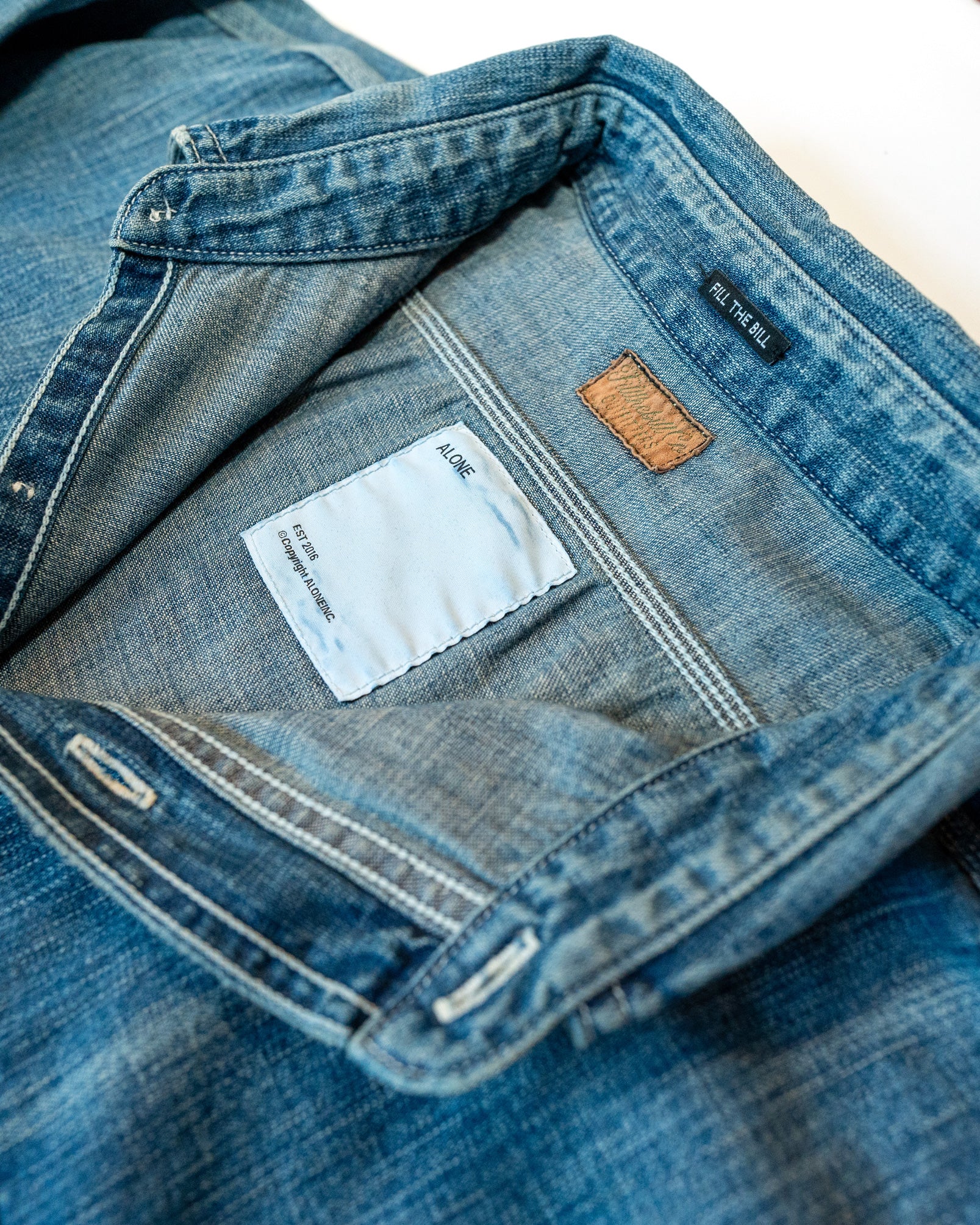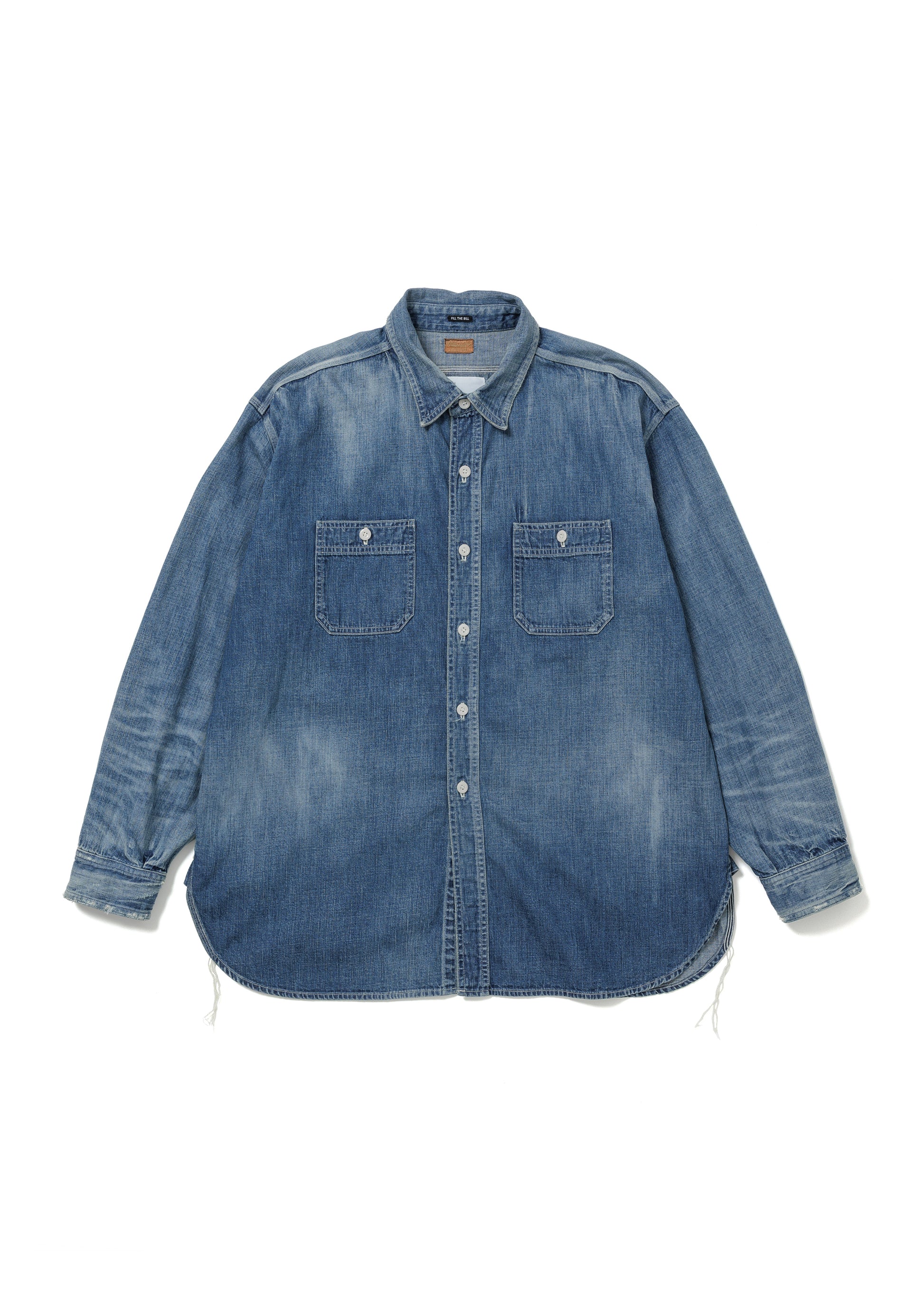 A collaboration between friends. FILL THE BILL's 4th Collaboration with ALONE. This Work Shirt has a slightly loose silhouette and includes distressing and purposeful repairs on the elbow. Based on vintage denim shirts brought by both parties, this item is packed with attention to detail, including the width of the hem, the amount of crease, and the distressing process, all of which were carefully considered to create the perfect look.